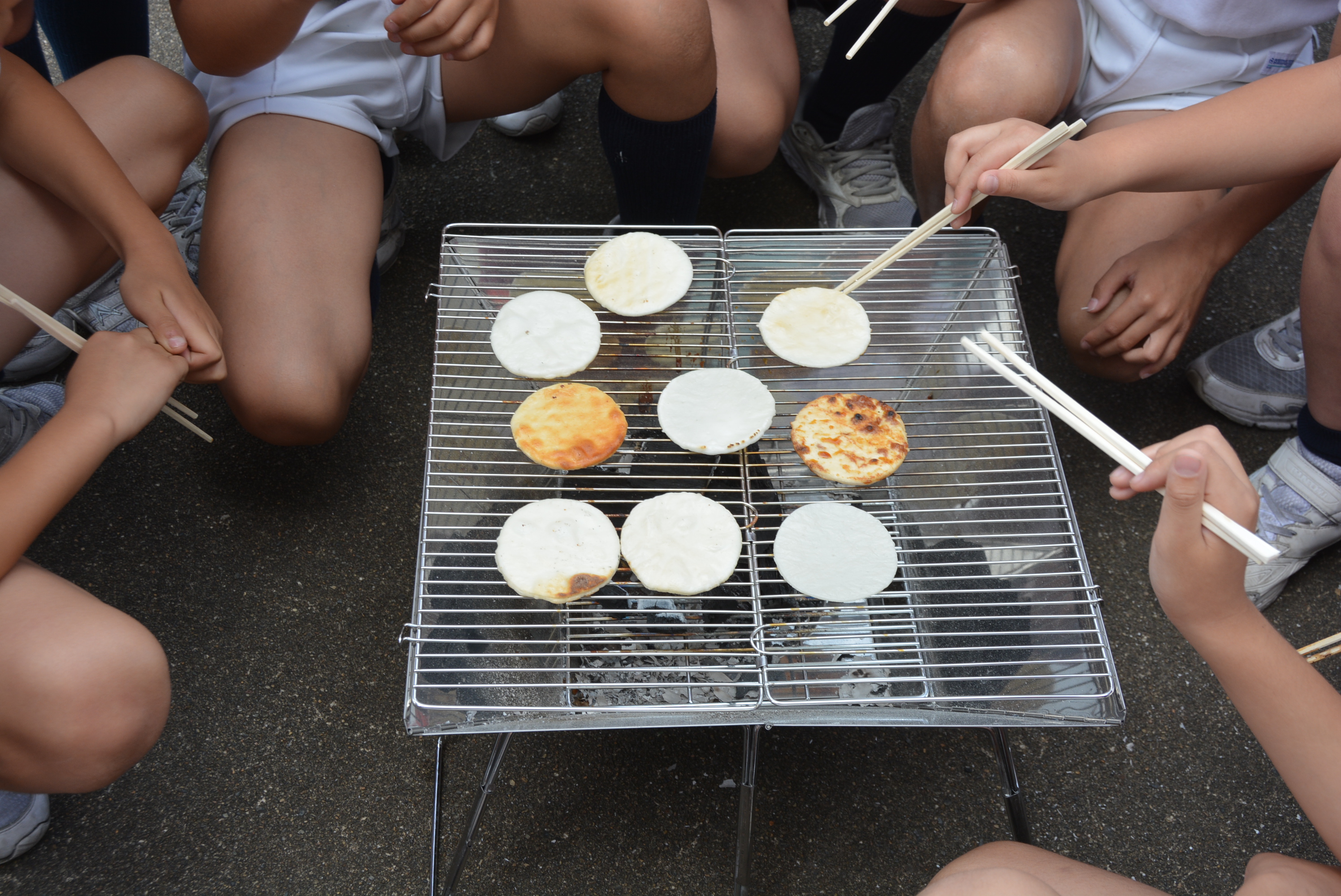 学内の芝生の場所で、焚き火台と炭を使って「せんべい」を焼きました。